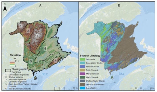 Visualization of the geographic location of New Brunswick, Canada (46.5653° N, 66.4619° W) outlining elevation change and physiographic regions (A) and an overview of bedrock lithology (B), overlain on World Ocean Basemap [30] in ArcGIS 10.3 software [31]. Bedrock geology was acquired from [28] (Scale 1:2,500,000).