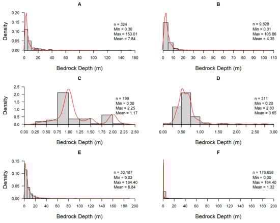 Histogram and continuous density distribution (red line) of bedrock depth for boreholes (A), drillholes (B), pedons (C), site cards (D), and well logs (E), and all data combined (F), including sample size, minimum, maximum, and mean DTB values for each source. Note: Depth intervals are (i) 0.25 m for pedons and site cards, and 5 m for the remaining sources, and (ii) the total sample size with minimum, maximum, and mean exclude the rock outcrop samples since all of these samples have a DTB of 0.