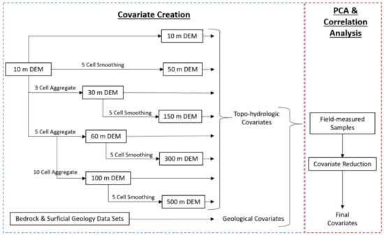 A framework was developed using several DEMs in combinations of increasing cell size (resolution) and localized averaging of neighboring cells (focal smoothing) of the original LiDAR-derived 10 m DEM to produce myriad topographic datasets via algorithms within ArcGIS and SAGA GIS software (Figure 4, Appendix A). In addition, each DEM was hydro-conditioned to fill depressions and ensure correct hydrological flow patterns and used to develop the hydrological datasets [38,39,40,41,42,43,44,45,46,47,48,49,50,51,52,53,54,55,56,57,58,59,60,61,62,63,64,65,66,67,68,69,70,71,72,73]. All gridded datasets (topo-hydrological and geological), hereafter referred to as the ‘covariates’ (n = 398), were resampled to 10 m resolution so that they shared: (i) spatial projection (NAD 1983 CSRS New Brunswick Stereographic); (ii) resolution (10 m); and (iii) spatial extent (number of columns and rows). Similarly, the point vector dataset (field-based DTB measurements) shared the same spatial projection as covariates. Within the modeling framework, the covariates created were annotated with their DEM resolution, e.g., 10 m resolution DEM abbreviated as ‘dem10′, whereas the 10 m DEM averaged using a 5-cell search window was abbreviated as ‘dem105′. The result was eight variant models for each of the DEM scales, e.g., 10 m (‘dem10′), 10 m smoothed (‘dem105′), 30 m (‘dem30′), 30 m smoothed (‘dem305′), 60 m (‘dem60′), 60 m smoothed (‘dem605′), 100 m (‘dem100′), and 100 m smoothed (‘dem1005′).