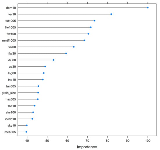 The RF variable importance plot highlighting the explanatory strength of the 20 most significant covariates with importance measured as decreasing from 100% (most important) to 40%. Covariate abbreviations are explained in Table 3.