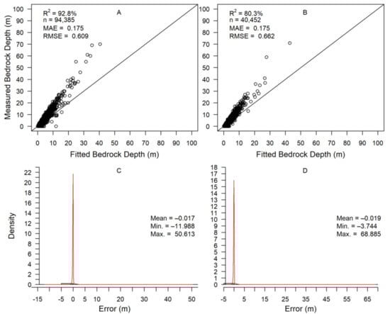 Although high-resolution datasets pertaining to topo-hydrology from a LiDAR-derived DEM were utilized in this analysis, it is difficult to fully capture the DTB variability across the landscape. This is due to the influence of past glacial events and the ongoing erosional and depositional processes, which have been acting on the soil and parent material for the past centuries since the Pleistocene glaciation. Varying surficial geological deposits have resulted in DTB values ranging from 0 m (exposed bedrock) on ridges and steep banks, to 80+ m in sediment-filled valleys. As such, existing delineations of surficial geology are unable to capture the full variability in changing surficial deposits and more information is required in the form of specific glacial deposit types (e.g., drumlins, kames, and eskers) and lithology of different deposits (the type of rock and grain size), since this will influence how easily weathered the material will be. These are reflected in the model results in Figure 8 with the maximum DTB prediction error reaching 30 m. Although lacking information, existing surficial geology datasets have importance in the DTB predictions since water-deposited materials (i.e., alluvial floodplains and glaciofluvial outwash plains) have more accumulated sediments on top of bedrock than some glacial and residual deposits (e.g., basal till and residual material). In any case, the ability to predict DTB at increasing depths will become more difficult since there are no single attributes explaining these depths. For example, the aggregate deposits do not specify the depth of the aggregates; thus, the bedrock could be 10 m from the surface or 80+ m. This is reflected in Figure 6 in which model performance decreases with DTB exceeding 5 to 10 m.