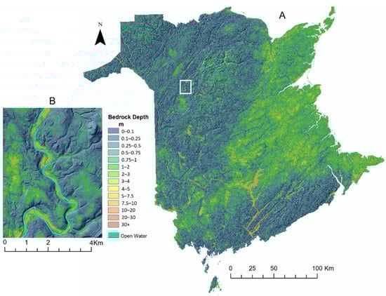 During the last glacial maximum (18,000 years (18 kyr)) ~30% of the Earths’ land surface was covered in ice [23]. As the climate warmed, this extent receded to ~10% of the Earths’ land surface, limiting ice to high latitudes and altitudes [24,25,26]. Post-glacial landscapes comprise a cacophony of features such as eskers, kames, kettles, moraines, outwash plains, terraces, deltas, etc., and the depth-to-bedrock in post-glacial landscapes can vary from >100 m, e.g., Northern Alberta, Canada, to <5 m, e.g., New Brunswick, Canada. Understanding the DTB at a landscape scale could significantly advance geological and hydrological sciences and applications in natural resource management and development, e.g., water supplies, mineral exploration, road building, and forest management. The objective of this study was to develop a high-resolution spatial map of DTB in a post-glacial landscape characterized by shallow overburden, covering 72,000 km2 region of New Brunswick, Eastern Canada as a case study. This was attempted by building an RF model utilizing field-acquired DTB measurements, high-resolution—LiDAR-derived—topographic and hydrographic derivatives, and geomorphological parameters. New Brunswick was selected for this analysis due to the variability in landforms, elevation, and geological features.