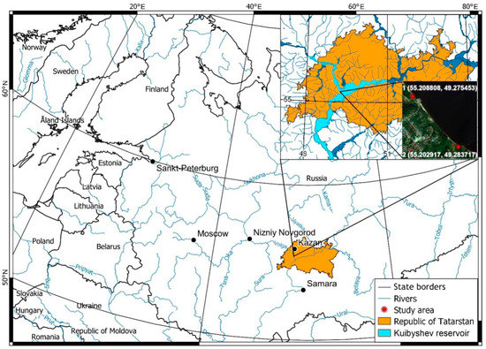The Kuibyshev reservoir, built on the Volga River, is the largest in Eurasia and the third-largest in the world, after Volta (Ghana) and Smallwood (Canada) reservoirs. It is located in the central part of the Middle Volga basin at the intersection of the forest and forest-steppe landscape zones of the Volga uplands and the Low Volga [72] (Figure 1). The geographic coordinates of the reservoir’s borders are 56°10′–53°30′ N, 47°30′–49°30′ E. There are three orographic regions within its basin: Volga Upland, Vyatka Predkamye, Low Volga. The research was conducted within the Volga Upland on the right side of the reservoir; its banks are steep and cliffy. Absolute heights are 175–215 m in the north and 250–270 m in the south. The maximum altitudes are confined to the Zhigulevskiy Mountains (349 m). The climate is characterized as temperate continental, with relatively warm and humid summers, cool and moderately snowy winters. The annual precipitation depth is 500–540 mm, in the warm season reaching 340–360 mm. The snow cover height is 30–37 cm, with a water equivalent of 90–95 mm.