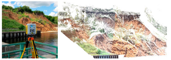 Various sources of information and observation methods were combined to estimate the intensity of abrasion and landslide processes at the reservoir shores. Shoreline positioning for the past periods (1958, 1985, 1987, and 1993) was obtained from archived historical aerial images (Kazan University Library); data for 1975, 2010, were obtained from satellite imagery interpretation. Field measurements at the study sites were conducted in 2002, 2003, 2005, and 2006 using Trimble M3 total station (2014). Since traditional methods mainly provide information about the planar displacement of the landslide scarp edge, the laser scanning method was additionally used in 2012–2014 to study the volume changes in hard-to-reach and hazardous areas. A Trimble GX TLS used as scanning equipment (Figure 5, Table 1). From 2019 onwards, field surveys include a DJI Phantom 4 UAV survey.