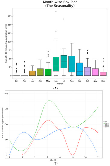 Seasonality (last decade) (A) and variability (B) of cumulative rainfall depth (mm.month−1) for days with more than 10 mm for the summer-fall periods of 2012–2014 at the study sites (according to Kazan Federal university meteorological station data).