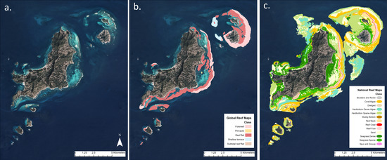 - Andrefouet, S.; Muller-Karger, F.E.; Robinson, J.A.; Kranenburg, C.J.; Torres-Pulliza, D.; Spraggins, S.A.; Murch, B. Global assessment of modern coral reef extent and diversity for regional science and management applications: A view from space. Proc. 10th Int. Coral Reef Symp. 2006, 2, 1732–1745. [Google Scholar]