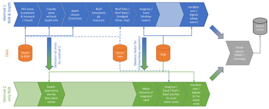 - Roelfsema, C.; Kovacs, E.; Ortiz, J.C.; Wolff, N.H.; Callaghan, D.; Wettle, M.; Ronan, M.; Hamylton, S.M.; Mumby, P.J.; Phinn, S. Coral reef habitat mapping: A combination of object-based image analysis and eco-logical modelling. Remote Sens. Environ. 2018, 208, 27–41. [Google Scholar] [CrossRef]