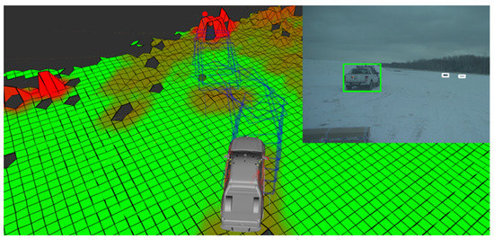 The RACER program aims to develop universal solutions designed to work with various UGV platforms in challenging terrain, taking into account the terrain conditions, at least in terms of adjusting the UGV speed to the environmental conditions. The program aims to develop an autonomy system that will not limit the UGV platform while driving off-road. In other words, if the UGV platform has been designed to drive in rough terrain up to 70 km/h, the autonomy system is to be able to safely navigate the vehicle up to this speed. The program’s primary objective is to develop an algorithm that adjusts the local path of the UGV in real time to maximalize the speed of the UGV while driving. Figure 1 presents an example of local path planning with traversability estimation. The algorithm adjusts the path of the UGV to avoid the snowdrift on the front of the platform.