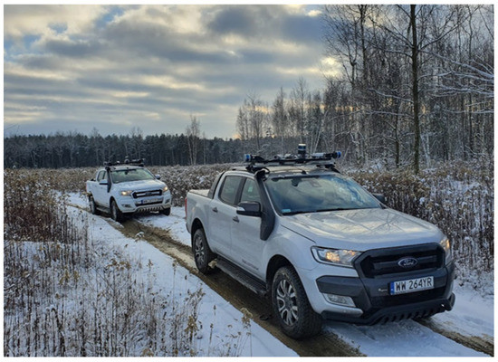 Figure 2 presents the Łukasiewicz—PIAP ATENA system demonstrators on which the research was performed. The demonstration of the ATENA system contains the off-road car with the Łukasiewicz—PIAP drive-by-wire system and Łukasiewicz—PIAP autonomy controller. The drive-by-wire system allows control of the steering wheel, adjusts the velocity of the vehicle, and controls the brakes, without losing the ability to control the vehicle by a human.