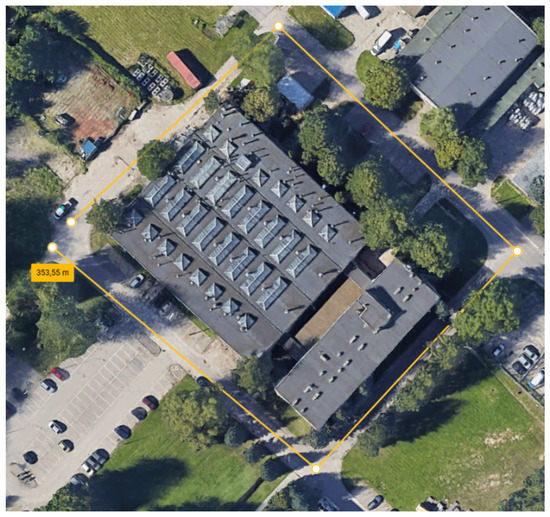 The present research data were collected using the ATENA core operating with the ROS package. One of the core functionalities of the ATENA program is the fusion of data from Velodyne LiDARs, information from the Xsens MTi-G-710 IMU sensor, and the odometry data from the CAN network of the vehicle. The system builds a 3D world model around the vehicle and creates a map as it moves. For the ATENA system, the model is built in a closed area limited to a square of 50 m × 50 m. To prepare a map of the surroundings, this limitation was turned off, which allowed building a full map of the surroundings around the building.