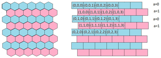 In the case of a square grid, we can easily calculate the coordinates of the cell of the array corresponding to the point (x,y). For hexagonal meshes, the calculation is more complex. The lack of an effective method of representing hexagonal meshes and a simple transformation algorithm from Cartesian coordinates to hexagonal coordinates precluded their usage. In [16], the array set addressing (ASA) method was described. The approach is based on representing the hexagonal grid as two rectangular arrays. Figure 4 presents the method of hexagonal grid representation. Different arrays are represented using different colors (pink and blue). The arrays are distinguished using a single binary coordinate. The complete address of a cell in a hexagonal grid is uniquely represented by three coordinates: