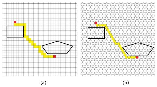 Path planning using square grids (a) and hexagonal grids (b). Black lines represent fragments of obstacles; yellow cells represent the planned path [1].