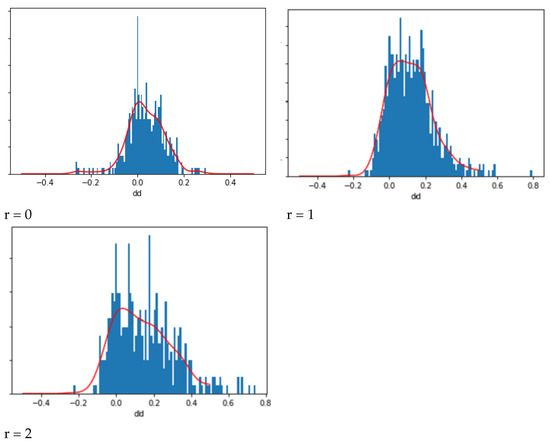 In grid-based path planning methods, we need to expand obstacles by a given number of cells. This operation is equivalent to the dilation used in machine vision. We performed each series of experiments for a different neighborhood value (from r = 0 to r = 2). The results of the experiments are presented in Table 2. Figure 17 shows histograms of the parameter dd and corresponding Gaussian KDE distributions.