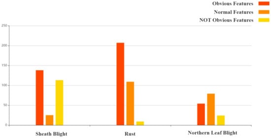 Through further statistical analysis of the dataset, we found that the distribution of the number of lesion features of the three disease images in the dataset sample is shown in Figure 3. About half of each disease image had obvious focal features, and a few had no obvious features. Among the sheath blight disease images, those without obvious lesions account for 40.9%, which will bring challenges to the training of the disease recognition model.