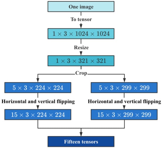 - Simple amplification. We use the traditional image geometry transform, including image translation, rotation, cutting, and other operations. In this study, the method proposed by Alex et al. [] was explicitly adopted. First, images were cut, the original image was cut into five subgraphs, and then the five subgraphs were flipped horizontally and vertically. Outsourcing frames counted the trimmed training set image to prevent the part of outsourcing frames from being cut out. In this way, each original image will eventually generate 15 extended images and the procedure of data augmentation is illustrated in Figure 4 and Figure 5.