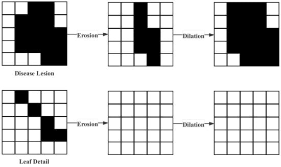 - Removal of interferential leaf details. Given the datasetβs characteristics in this paper, many details in the maize leaf images will interfere with the model, so erosion and dilation [] were used to preprocess the data. First, the erosion operation is performed. The logical operation process is shown in Equation (1). The leaf details can be removed through the erosion operation, but this operation would also change the characteristics of the lesion. Therefore, the dilation process was necessary, and the logical operation process is shown in Equation (2). In Equations (1) and (2), A represents the original image, and B represents the operator. The original characteristics of the lesion can be restored through the expansion process. The operation process above is shown in Figure 6.
