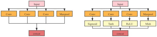 Figure 10. MAF module applied to the ResNet series (the original one is on the left; the optimized one is on the right). - In the GoogLeNet, as shown in Figure 11, an MAF module was applied inside the inception module. Diverse activation functions were applied to the branches inside the inception accordingly.