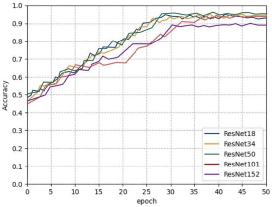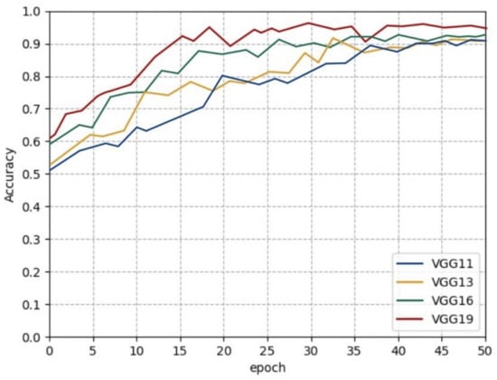In this paper, the samples were divided into training and validation sets according to 9:1, The loss function optimization strategy used for training was SGD (stochastic gradient descent) [], where the momentum parameter was set as 0.9, and the batch size parameter was set as 50. After 50 iterations, the accuracy of the validation set tended to converge. Further training will lead to a decrease in the accuracy of the validation set and overfitting. Thus, the model parameters were selected as the model parameters trained after 200 iterations.