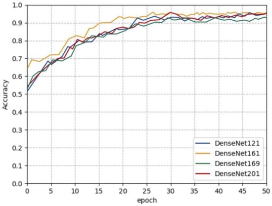 Since each model of the VGG series, ResNet series, and DenseNet series contained many sub-models. Moreover, the subsequent experiments to test the accuracy of different activation function combinations, which consisted of different sub-models and different functions, were too complicated. Consequently, benchmarks were performed on all sub-models of these three networks. The experimental results are shown in Figure 12, Figure 13 and Figure 14. It could be concluded that VGG19, ResNet50, and DenseNet161 performed best among the three network models. Thus, subsequent experiments would adopt these three sub-models to test the self-network models.