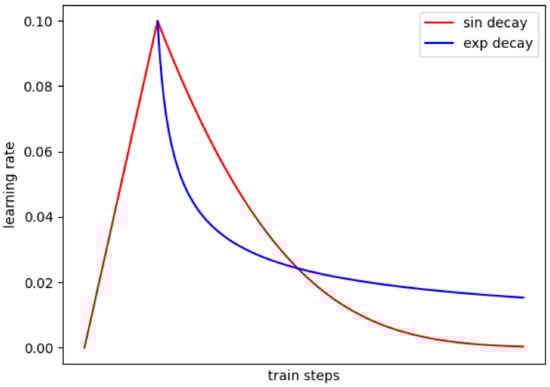 warm-up was tested in this paper, i.e., the learning rate increases linearly from a small value to a preset learning rate, and then decays according to function law. At the same time, the warm-up is tested, the learning rate increases linearly from a tiny value and decays after reaching a preset value according to the function law. For the two pre-training methods, the changes are shown in Figure 15.