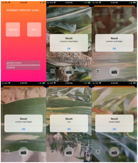 To verify the robustness of the MAF module proposed in this paper, we also used the data set collected from the Science Park in the west campus of China Agriculture University, including the images of maize diseases such as southern leaf blight, fusarium head blight, and those three kinds mentioned above. Additionally, we developed the mobile detection device based on the iOS platform, which won the second prize in The National Computer Design Competition for Chinese College Students. As shown in Figure 20, the optimized model based on the proposed method can quickly and effectively detect maize diseases in practical application scenarios, proving the proposed modelβs robustness.