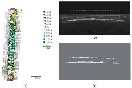 The “bowl effect” of self-calibration BA for long corridor UAV images. (a) The result of commercial software AgiSoft Photoscan V1.4.1, Z error is represented by the ellipse color, and X, Y errors are represented by the ellipse shape. (b) The result of commercial software Reality Capture V1.2, and (c) the result of open-source software AliceVision.