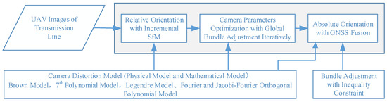 The proposed method mainly studies camera self-calibration in the incremental SfM framework, which is used to accurately estimate the image orientation and camera intrinsic parameters. Firstly, the most commonly used camera distortion models are analyzed in Section 2.1, including physical models and mathematical models. Secondly, the BA with inequality constraint is investigated in detail in Section 2.2. Finally, the camera self-calibration strategy is introduced for the long corridor structure of UAV images in Section 2.3. Figure 2 describes our main research contents. The camera distortion model introduced in Section 2.1 is applied in the proposed camera self-calibration method, and the bundle adjustment with inequality constraint described in Section 2.2 is applied in the absolute orientation of the proposed camera self-calibration method.