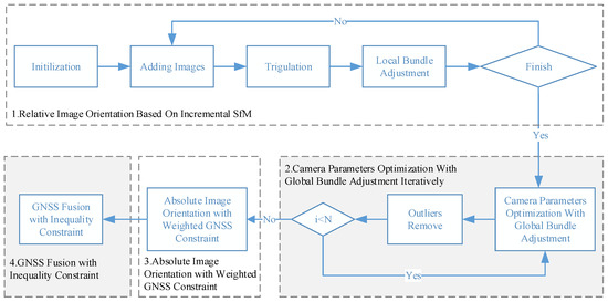 Therefore, a camera self-calibration method is proposed, which combines the camera parameters initialization and high-precision differential GNSS position information fusion. The workflow is shown in Figure 4, and details of key steps are listed as follows: