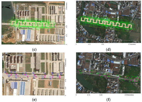 UAV images of the test sites. (a,c) The rectangle and S-shaped datasets of test site 1, respectively; (b,d) the rectangle and S-shaped datasets of test site 2, respectively. (e,f) the location distribution of GCPs in test site 1 and test site 2.