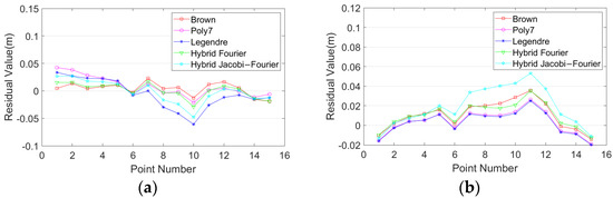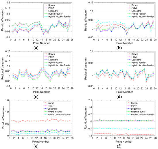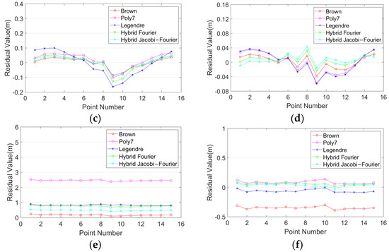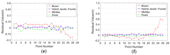 For further analysis, we can see the following: (1) For the rectangle dataset of test site 1, the horizontal and vertical accuracy with the Brown model was higher than other distortion models. However, for the other three datasets, the accuracy of the Brown model was the worst. (2) From the comparison of camera self-calibration between the Poly7 model and the Legendre model, it can be seen that the horizontal accuracy of Poly7 was better than the Legendre model for all the datasets. Further, the Poly7 model had better vertical accuracy in the S-shaped dataset of test site 2. However, the Legendre model had better vertical accuracy than the Poly7 model in the other three datasets. The main reason is that the orthogonality of the Legendre model can improve the accuracy of focal length for camera self-calibration, and then improve the vertical accuracy, but meanwhile, it loses the horizontal accuracy. (3) From the comparison of camera self-calibration between the hybrid Fourier model and hybrid Jacobi–Fourier model, it can be seen that the horizontal accuracy of the two models had little difference. However, the vertical accuracy of the hybrid Jacobi–Fourier model was better than the hybrid Fourier model in general (except for the S-shaped dataset in test site 2).