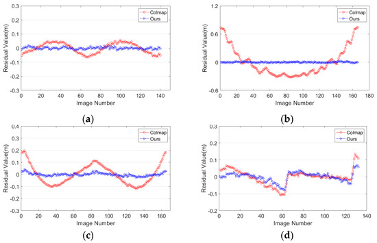 To verify the feasibility of the proposed strategy for camera self-calibration, this paper is compared with the scheme of ColMap [38]. Since ColMap does not implement the GNSS-constrained BA, the similarity transforms were applied for the projection center of images and GNSS after the final global BA in ColMap. Then, the weighted BA with GNSS as described in Formula (12) was conducted. Considering that ColMap does not provide any mathematical distortion models, the Brown model was adopted to make the experimental comparison.