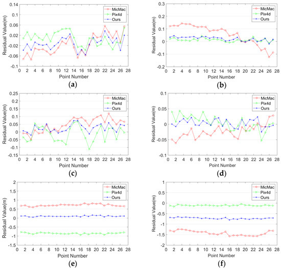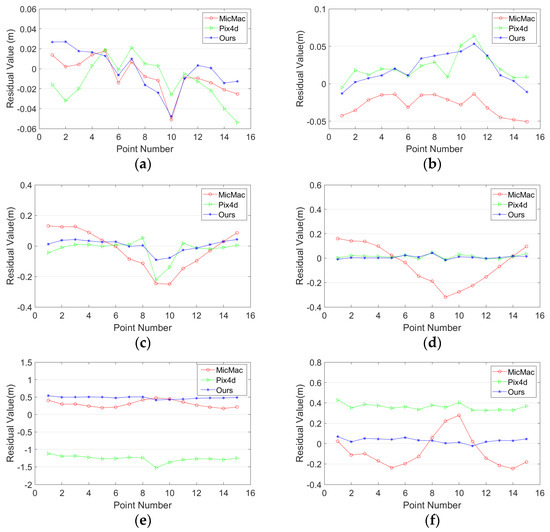 The residuals of check points after self-calibration with different software for test site 2. (a,c,e) The residuals of check points of rectangle dataset in the direction of X, Y, and Z, respectively; (b,d,f) the residuals of check points of S-shaped dataset in the direction of X, Y, and Z, respectively.