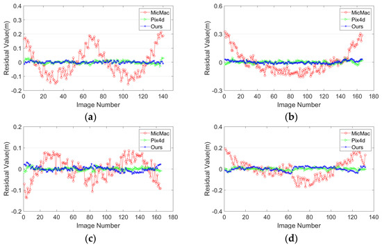 From the analysis of the vertical accuracy, the following can be seen: (1) The proposed method had the smallest standard deviation in the datasets except for the S-shaped dataset of test site 2. Pix4d had the smallest standard deviation in the S-shaped dataset of test site 2. MicMac had the largest standard deviation in the four datasets and the accuracy fluctuates greatly. (2) For test site 1, the RMSE values of MicMac were the smallest, but it had the largest standard deviation and the reconstructed model had obvious bending, as shown in Figure 12a,b. Pix4d had the smallest RMSE and standard deviation in the S-shaped dataset of test site 2. The possible reason is that the feature points matching of Pix4d is more robust with the large change of illumination. However, the RMSE values of Pix4d in the vertical direction were 0.787 m, 0.324 m, and 0.74 m larger than the proposed method, which indicates that the proposed has better accuracy in the vertical direction. To sum up, compared with MicMac and Pix4d, the proposed method still has certain advantages.