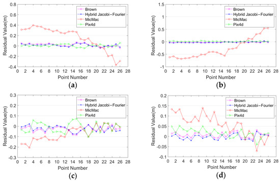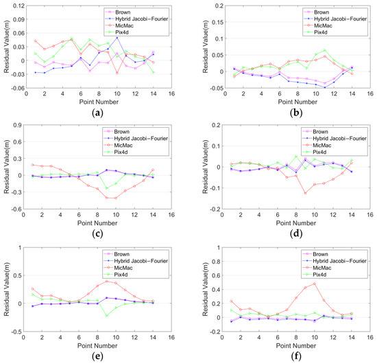 The open-source software MicMac and the commercial software Pix4d Mapper were selected to compare and analyze with the proposed method. Based on the comparative experiments mentioned above with different distortion models, it was found that the overall performance of the hybrid Jacob–Fourier model was the best. Therefore, the hybrid Jacobi–Fourier distortion model was selected for further comparative analysis. The F15P7 distortion model was adopted in MicMac with the strategies proposed in [25]. The distortion model of Pix4d Mapper was unknown. In this section, self-calibration is conducted without and with GCPs.