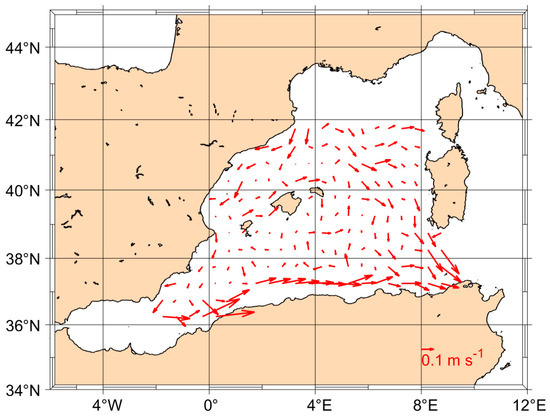 Figure 3 represents the mean velocity “Ū” resulting from the pseudo-Eulerian analysis of the drifter trajectories available in the Mediterranean Surface Velocity Programme (medSVP) database. The red arrows indicate mean surface current field. The main flow calculated through the drifter dataset well represents the mean surface circulation in the study area. Higher velocities are found in correspondence of the AC and of the Liguro–Provençal current along the basin boundaries.