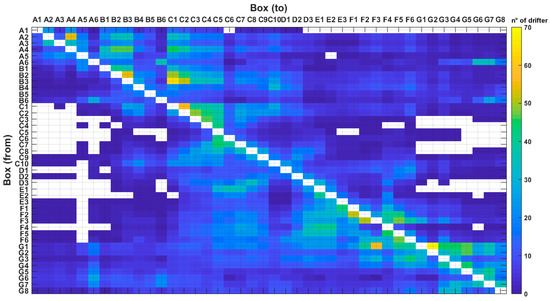 The results of the connectivity analysis on the drifters and AE tracks are presented in the following figures in the form of square matrices (Figure 5, Figure 6 and Figure 7). The 1° × 1° boxes that represent the source areas are reported on the y-axis, the destination ones on the x-axis.
