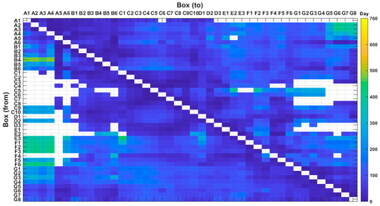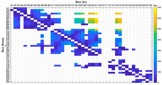 Mean transit time of anticyclonic eddies connecting the 42 boxes of the WMED. Each box extends over a 1° × 1° cell. Anticyclonic eddy tracks data refer to the 1993–2016 period.