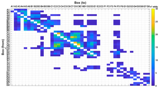 Number of anticyclonic eddies connecting the 42 boxes of the WMED. Each box extends over a 1° × 1° cell. Anticyclonic eddy tracks data refer to the 1993–2016 period.