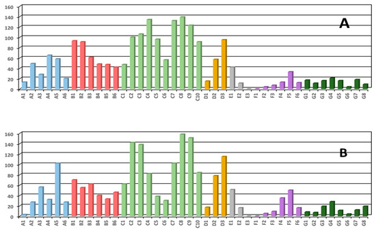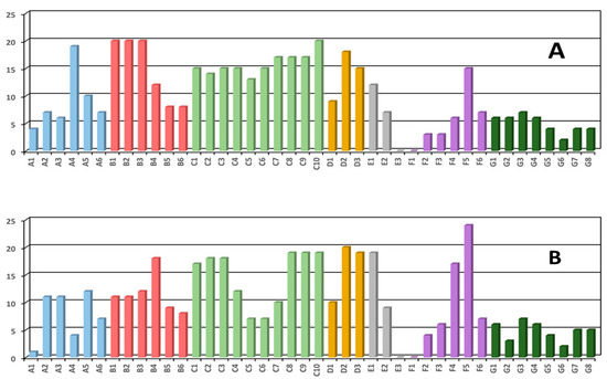 The connectivity matrix shows the existence of many connections among the different areas (Figure 5). Sectors of the Western Algerian Basin (A, B) and of the Balearic Sea (G) can export drifters toward all the WMED areas. The same happens for the C9 and C10 areas. Only few areas are not connected: for instance, most of the boxes included in the south-eastern C sector; the D3, E1 and E2 areas that do not export toward the western Algerian Basin (A,B) and in many boxes of the Balearic Sea (G). These results agree with the mean circulation of the basin showed in Figure 3 and described in previous studies (e.g., [62]).