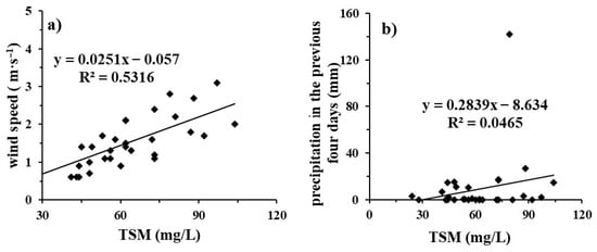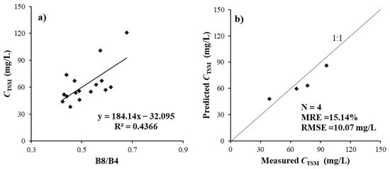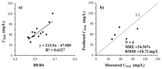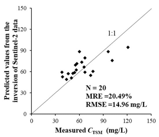 - The accuracy of the TSM concentration inversion model based on ground-measured data and synchronous Sentinel-2 image data was high, with MRE and RMSE values of 15.14% and 10.07 mg/L, and 20.49% and 14.96 mg/L being obtained, respectively.