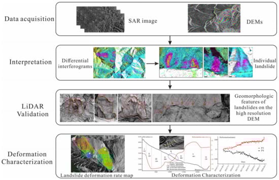 In this study, InSAR and airborne LiDAR technologies were integrated to identify and map landslides in Danba County and the surrounding areas, accompanied by a new procedure for landslide identification and deformation monitoring. The aims of this study were: (1) To use stacking InSAR technology to detect landslides in a large area, and then use LiDAR data to validate the InSAR detection results in a smaller area, and eventually improve the accuracy and reliability of landslide identification in the complex mountainous areas with dense vegetation cover; and (2) to analyze the time-series deformation characteristics of typical landslides based on high-precision LiDAR-DEM and rainfall data.