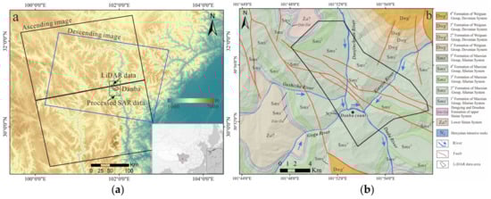 (a) Location of Danba County and coverage of the SAR datasets; (b) tectonic and geological map of the study area.