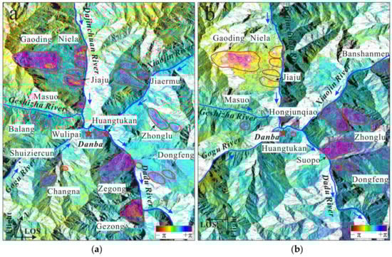 Geometrically corrected and filtered differential interferograms of the Sentinel-1 stacking InSAR: (a) ascending image pair; (b) descending image pair.
