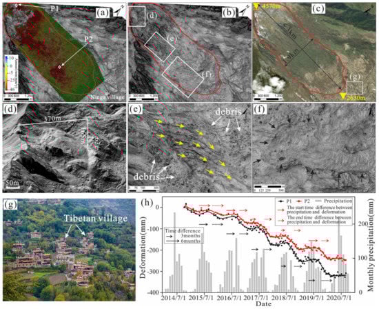 The Gaoding landslide in Niega Town and the relationship between its time-series deformation and rainfall: (a) InSAR-acquired annual average deformation rate of the Gaoding landslide; (b) airborne LiDAR-SVF image; (c) optical image; (d) local landslide at the rear edge of the Gaoding landslide; (e) strong deformation in the middle of the Gaoding landslide, with yellow arrows showing the landslide movement path; (f) a strongly deformed area on the right side of the front edge of the Gaoding landslide, with black arrows indicating the local sliding boundary; (g) Jiaju Tibetan Village; (h) time-series deformation at Points P1 and P2 against monthly precipitation.