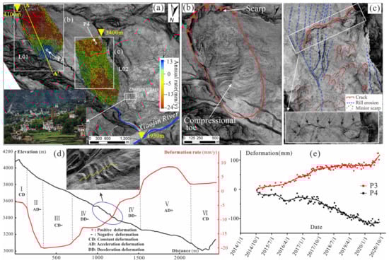 Points P3 and P4 were selected for time-series deformation analysis (Figure 7e). Slow and uniform deformation was observed at Point P3 from October 2014 to October 2017, followed by accelerating deformation from October 2017 onward. Constant slow deformation was seen at Point P4 from October 2014 to September 2020. According to the areas with positive and negative displacements rates observed Figure 7a,e, the landslide L01 could be a rotational landslide.