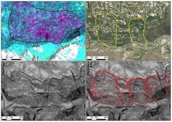 InSAR could detect the deforming slope area, but its ability to accurately characterize its boundary was relatively weak [38]. In this context, it was feasible to combine InSAR and LiDAR to more accurately draw the boundary of the landslide, including the secondary boundaries caused by multiple sliding. As shown in Figure 10a, the black line in the differential interferogram of the Zhonglu Town marks the suspected deformation area. Similarly, only two landslides could be identified in the high-resolution optical image (the yellow solid lines in Figure 10b). In contrast, the boundaries of all landslides could be accurately delineated in the LiDAR image (Figure 10c). Moreover, even some small features such as landslide ridges and secondary sliding boundaries could be determined from the LiDAR image (Figure 10d).