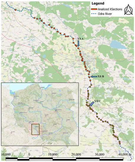 Figure 3 depicts the location of the cross-sections (orange) that were analyzed (around seventy in total, from which forty were selected, where the river bed did not show significant differences from the time of the geodetic survey and the time of the data collection due to natural hydromorphological changes) in this contribution along the canalized part of the Odra River and their geographical location in Poland.