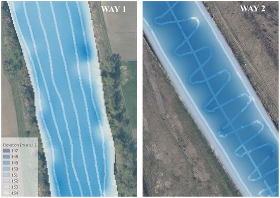 Santillan et al. [] stated that the parallel method of navigation gives less accurate results than cross-sections and zig-zags, but their results concern a wide reservoir (not a shallow river) and the dataset contains only three paths (and less data points than the other compared methods). Of course, a set of orthogonal cross-sections as dense as parallel lines would improve the accuracy of the interpolation, but such method of navigation may consume a lot of time and it is inconvenient for surveying long river reaches. This conclusion is compatible with the statement of Kruger et al. [] that one must choose a strategy based not only on the accuracy, but also on the workload and costs.