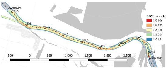 In Figure 6, the DiBM of the reach from the barrage “Ujście Nysy” to the Barrage “Zwanowice” is depicted. This RBM was created using the interpolation method within the software Reefmaster for data acquisition from Lowrance echo sounders.