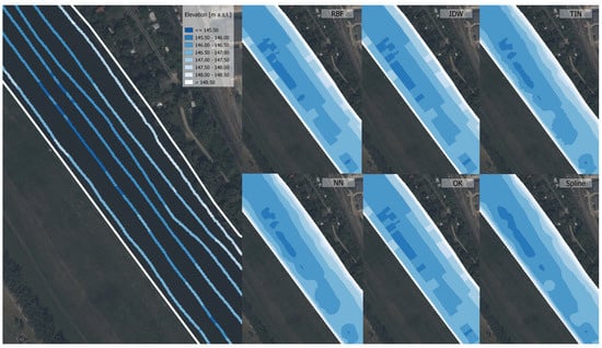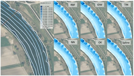 For this contribution, six interpolation methods were used for the comparison of the RBM/DiBM generation along the Odra Cascade, namely: RBF, IDW, TIN, NN, OK, and Spline. In Figure 7, the generation of six different bathymetric models is depicted for a short nonstraight reach, while in Figure 8, the DiBMs are depicted for a straight reach.